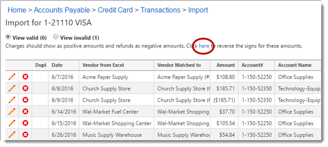 - Click the Edit icon to make changes to individual transaction or click the Delete icon to delete a transaction. These changes do not affect the original Excel file that was used for importing.
