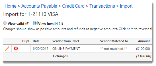 - Invalid transactions can be viewed by clicking the View Invalid radio button. Invalid transactions occur when the information from the Excel file does not match with the fields in your Financials program. Other invalid transactions may include payments, which are normally entered on the Transactions > Update page. After an invalid transaction has been corrected, it appears as a valid transaction to be imported.