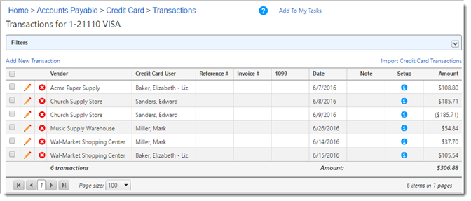 - The imported transactions appear on the Credit Card > Transactions page. At this point, you can process these transactions as you normally would.