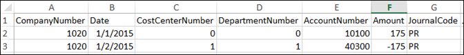 - JournalNumber: The journal number should be unique for each group of detail lines that you would like to import. For example, if rows 1-10 are for one journal entry and rows 11-20 are for a second journal entry, you can specify journal number 1 for rows 1-10 and journal number 2 for rows 11-20. When the journal is imported, each group of detail rows will be grouped together and assigned the next available journal number. This eliminates the possibility of importing duplicate journal numbers that have already been assigned in the General Ledger.