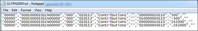 Save the entries into a quote and comma delimited text file - 9 fields per record. Name this file GLTRN2000.txt. Click the Browse button and select the file. Click the Import button to begin the import process or click the Cancel link to return to the Unposted Journals page.